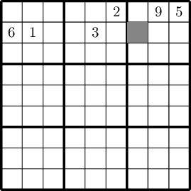 (I should point out that there is also the sudokubundle package, which is actually three packages: one that allows you to typeset puzzles from an input file, another one that attempts to find a solution to a specified puzzle, and a third that generates puzzles. I have not played around with this one at all, other than to find out that it also lacks a way to shade a given cell in the grid. For more information on this package, please visit “Sudoku Solvers“.)