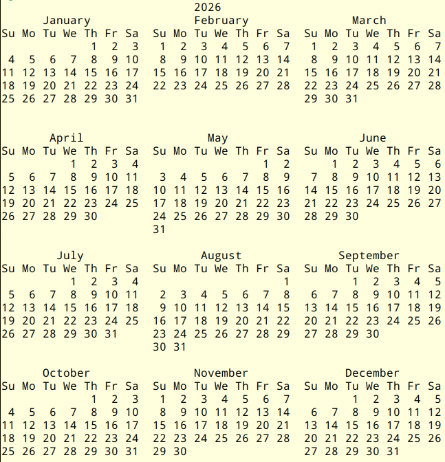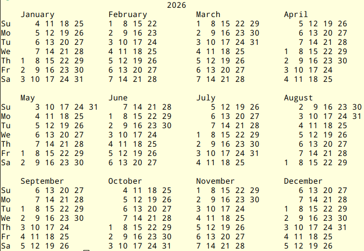 Well, it’s worth a shot, anyway. Here is the output of the cal 2026 command: