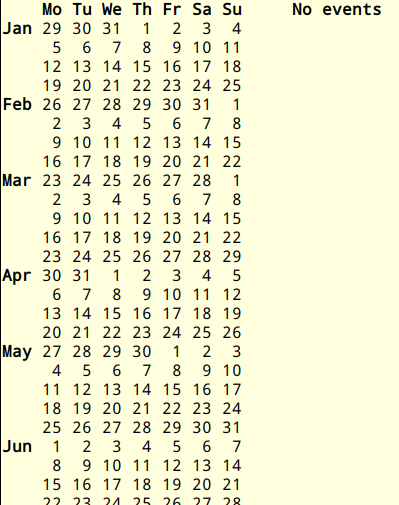 Now we are getting somewhere. That’s exactly what I’m looking for. (Notice that khal defaults to Monday as the first day of the week, which is what I wanted. If you want your week to start on Suday, see below.)